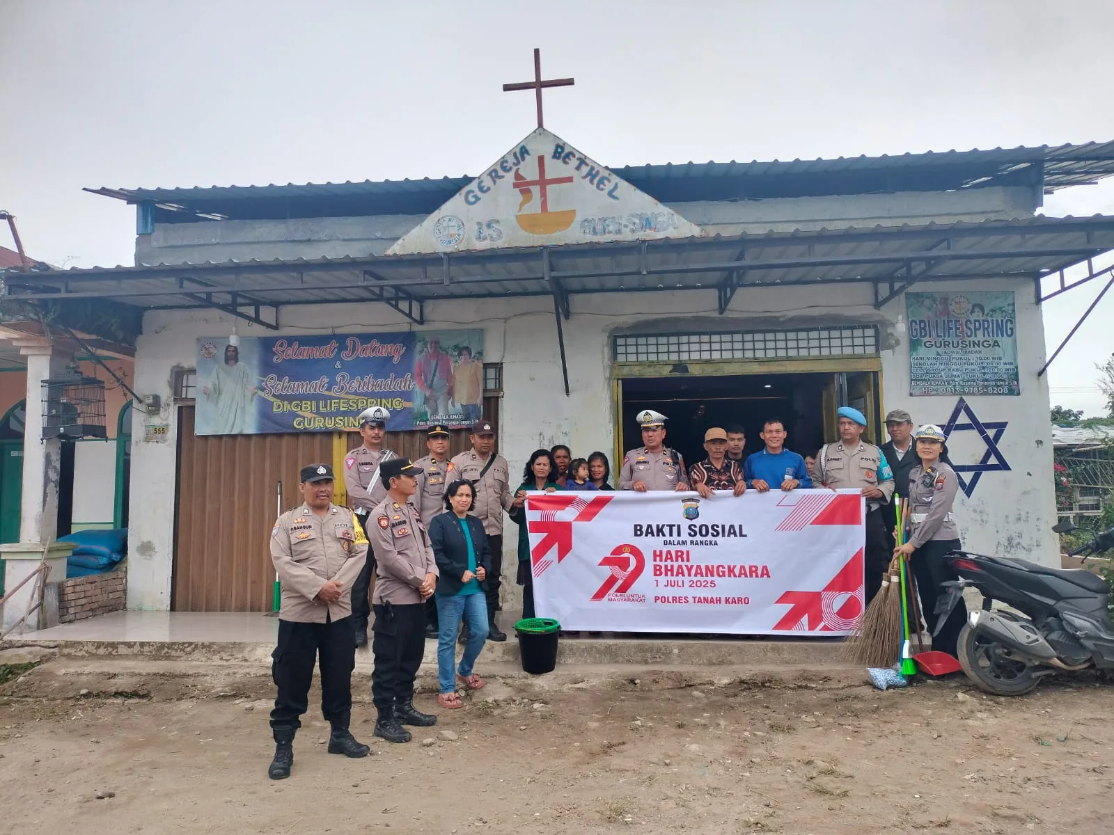 KARO SUMUT, Djawaranews.com – Dalam rangka menyambut Hari Ulang Tahun ke-79 Bhayangkara tahun 2025, Polsek Berastagi menggelar kegiatan gotong royong dan bhakti sosial di Rumah Ibadah Gereja GBI Lifesprings Desa Guru Singa, Kecamatan Berastagi, Kabupaten Karo, pada Minggu(22/06/2025).
